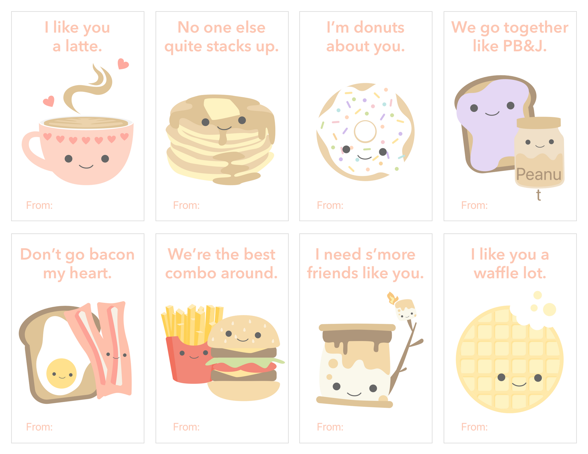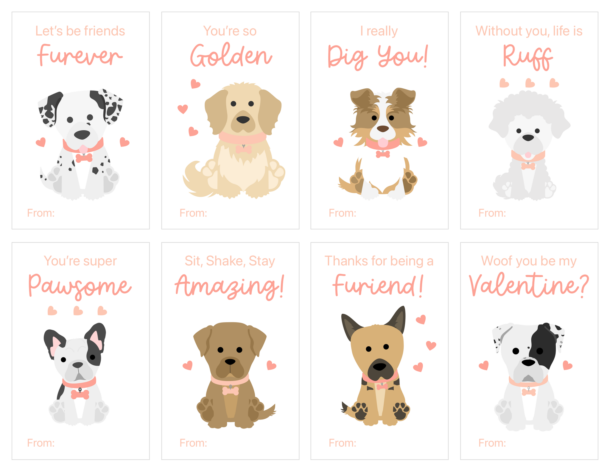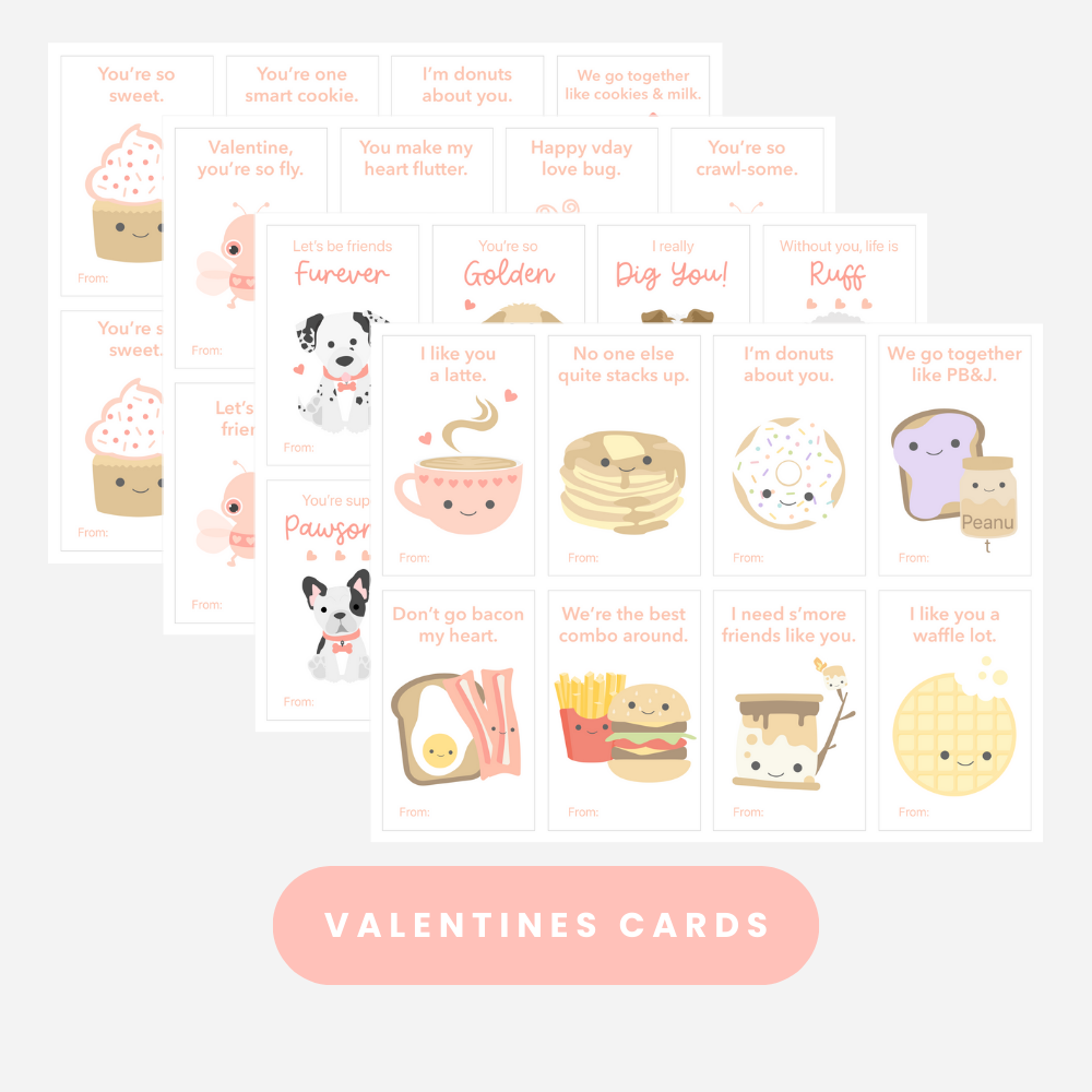This free digital Valentine printable includes multiple themed card sets with friendly illustrations and playful wordplay that kids love. Just print, cut, and share—no candy, toys, or prep required.